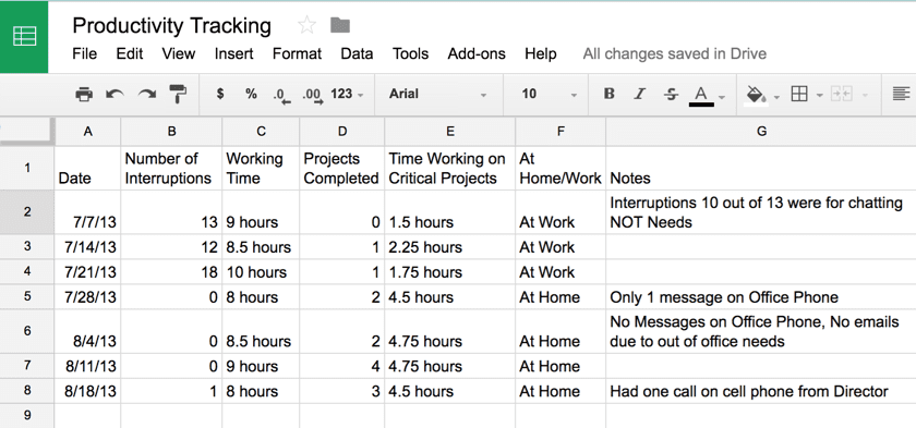 Terakhir, saya mencatat beberapa metrik yang relevan, seperti jumlah interupsi dan waktu yang dihabiskan dalam rapat. Saya membandingkan kinerja saya sebelum bekerja jarak jauh dan setelahnya untuk menunjukkan peningkatan produktivitas.