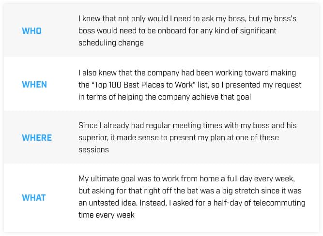 Saya juga menjelaskan bahwa bekerja dari rumah — bahkan beberapa jam seminggu — akan membuat saya jauh lebih produktif. Saya akan dapat berkonsentrasi pada proyek-proyek besar tanpa terganggu oleh rekan kerja yang terus-menerus “melewatkan diri” atau meminta saya menghadiri rapat yang tidak perlu hanya karena saya ada di sana.