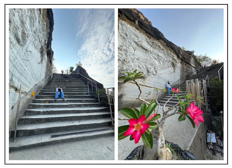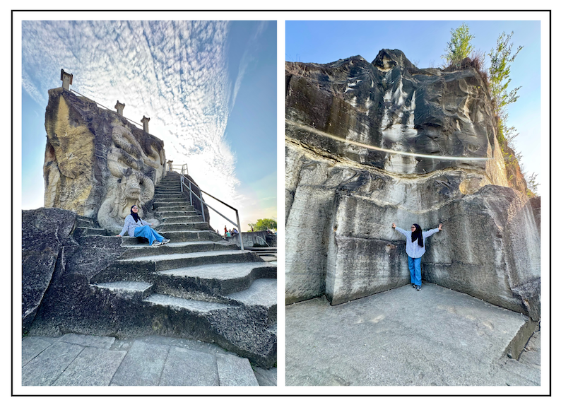 Di depan kedua batu tinggi ini ada pijakan luas yang bisa menjadi lahan berdiri wisatawan untuk memotret. Semua diatur sedemikian rupa agar bisa menampung sekian banyak tamu. Semennya dibuat sedikit kasar dengan warna natural yang cantik saat berpadu padan dengan bukit kapur.