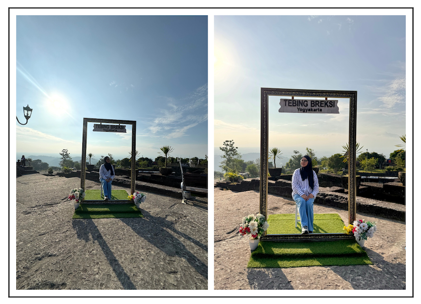 Di dekat Tlatar Seneng ini saya bisa melihat spot foto berupa gerbang kecil berbahan kayu dengan plang tulisan Tebing Breksi Yogyakarta di bagian tengah. Posisinya membelakangi pemandangan alam. Jadi jika cahaya matahari tidak berada di atas kepala, bisa memunculkan efek backlight.