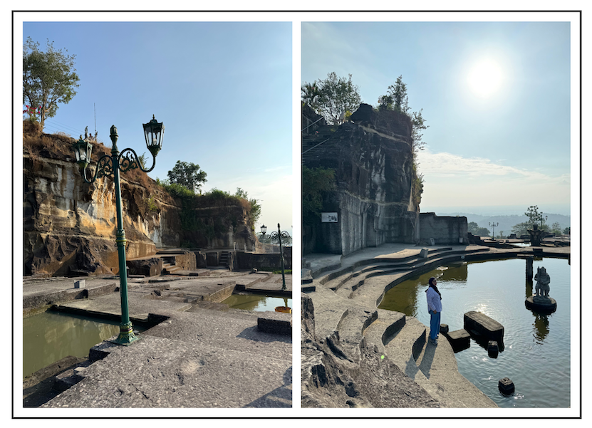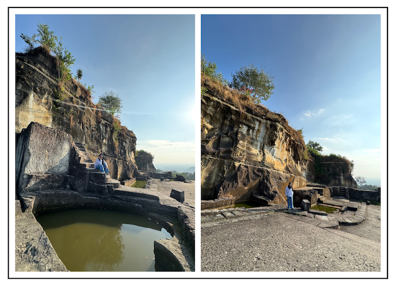 Dari beberapa jejak dari dua batu kapur yang tinggi ini, ada satu kawasan terbuka dengan banyak dudukan yang tersusun berundak-undak seperti open amphitheater. Bentuknya melingkar dengan sebuah kolam di bagian tengah. Ada juga beberapa semen tempat berdiri berbentuk lingkaran. Saya sendiri sempat berdiri di atas pijakan itu. Posisi ini memungkinkan saya melihat ke beberapa penjuru arah yang berada di seputaran Tlatar Seneng. Nama dari area yang diatur seperti amphitheater ini. Dari beberapa tautan yang saya baca Tlatar Seneng bisa dijadikan tempat untuk live performance. Tapi bagaimana ngaturnya ya jika pusat pertunjukannya tergenang air begitu sementara pijakan di bagian tengah itu hanya sedikit?