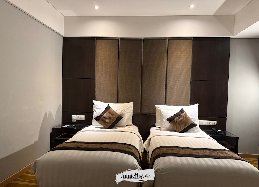Kamar yang kami tempati (tipe premiere) ini cukup luas untuk ditempati bertiga. Suami yang tadinya memesan kasur dengan tipe King, nyatanya terpaksa dirubah menjadi twin karena saya sudah kesorean check-in. Pengen protes tapi hayati dan fisik sudah terlalu lelah. Antrian yang mengular, menurut hemat saya, bisa jadi alasan kuat bagi para petugas untuk bersegera melayani setiap tamu yang datang. Apalagi tadi sempat ada tamu yang datangnya berombongan hampir seRT. Banyak anak kecilnya pulak. Heboh pastinya.