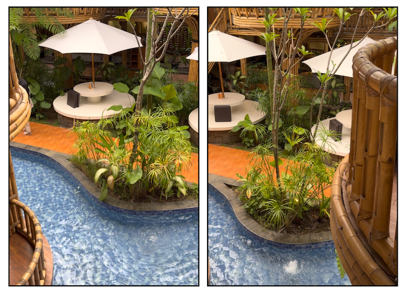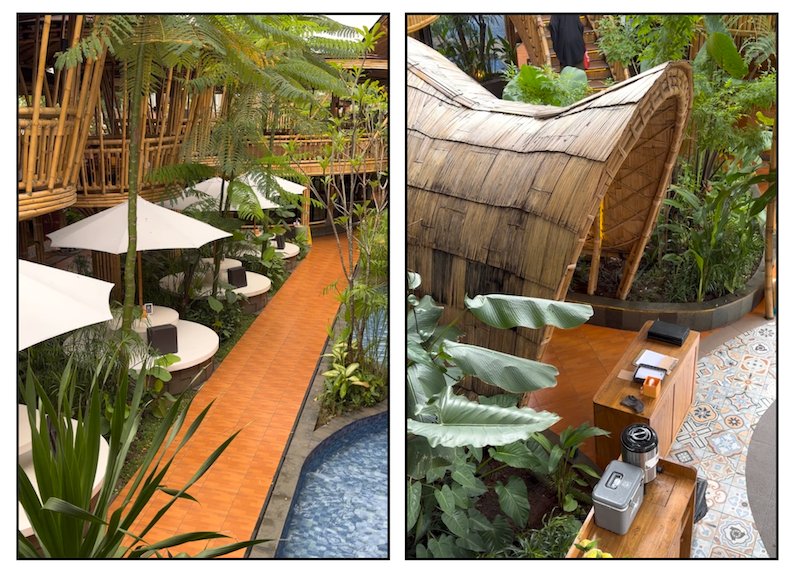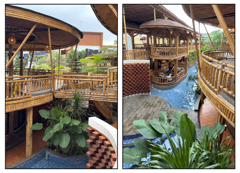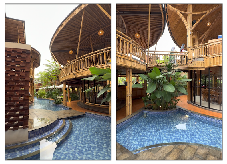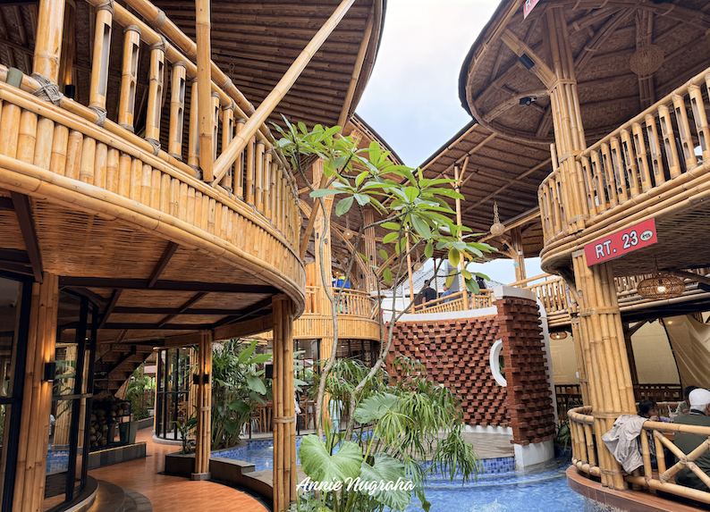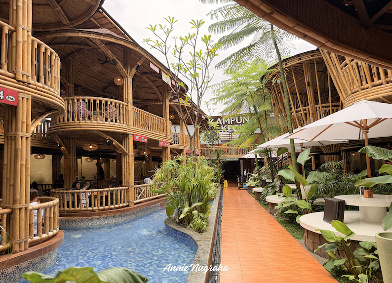 Di sini, di ruang terbuka, kita bisa melihat kolam air dengan ubin biru dan air yang jernih bening. Di berbagai sudut tumbuh banyak pohon dan dedaunan hijau yang membuat nuansa pedesaan di lantai bawah ini semakin asri serta menyejukkan. Selain berbagai opsi ruang makan, juga ada spot berfoto dengan latar belakang susunan batako yang tertata apik seperti panggung kecil. Sederhana tapi tetap mengesankan.