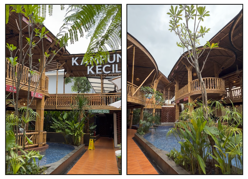 Saya gak menyangka bahwa ternyata resto Kampung Kecil Karawang tidak berada di sebuah lahan luas dan dalam posisi stand alone seperti biasanya. Tapi ternyata ada di belakang deretan ruko dan berdampingan dengan pintu masuk sebuah perumahan elit. Pintu utamanya sendiri mudah dilihat dari kejauhan karena fasad yang terbuat dari kaitan bambu tersebut disusun tegak menjulang dengan tulisan jenama yang eye-catchy di sisi paling atas. Gampang sekali ditandai.